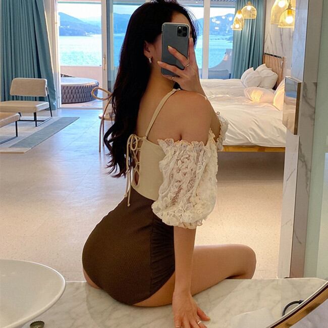 ◎【送料無料】ワンピース水着 一体型 ワイヤーなし 体型カバー水着 パット付き 女性用 オフショルダー 透け感あり