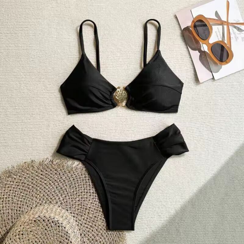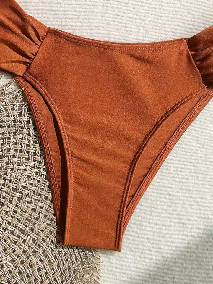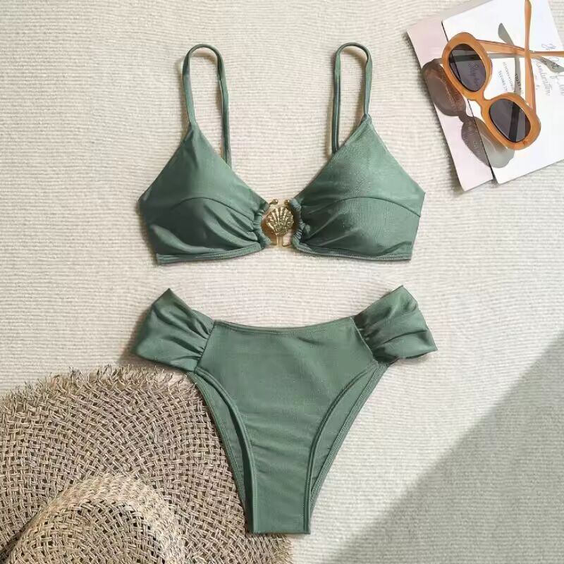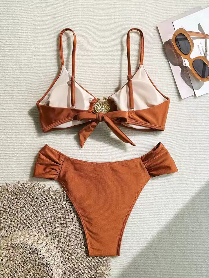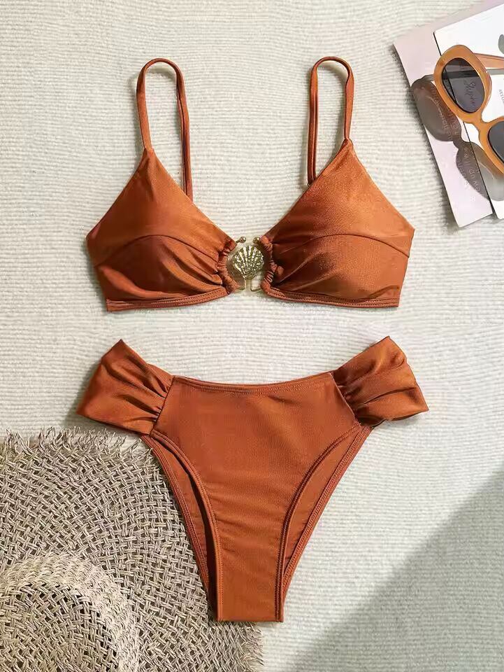 【送料無料◎】 セクシーなプリーツハイウエストビキニセット 2025 レディース オレンジ メタルバックル プッシュアップ ツーピース水着 ビーチ水着 ホリデー水着