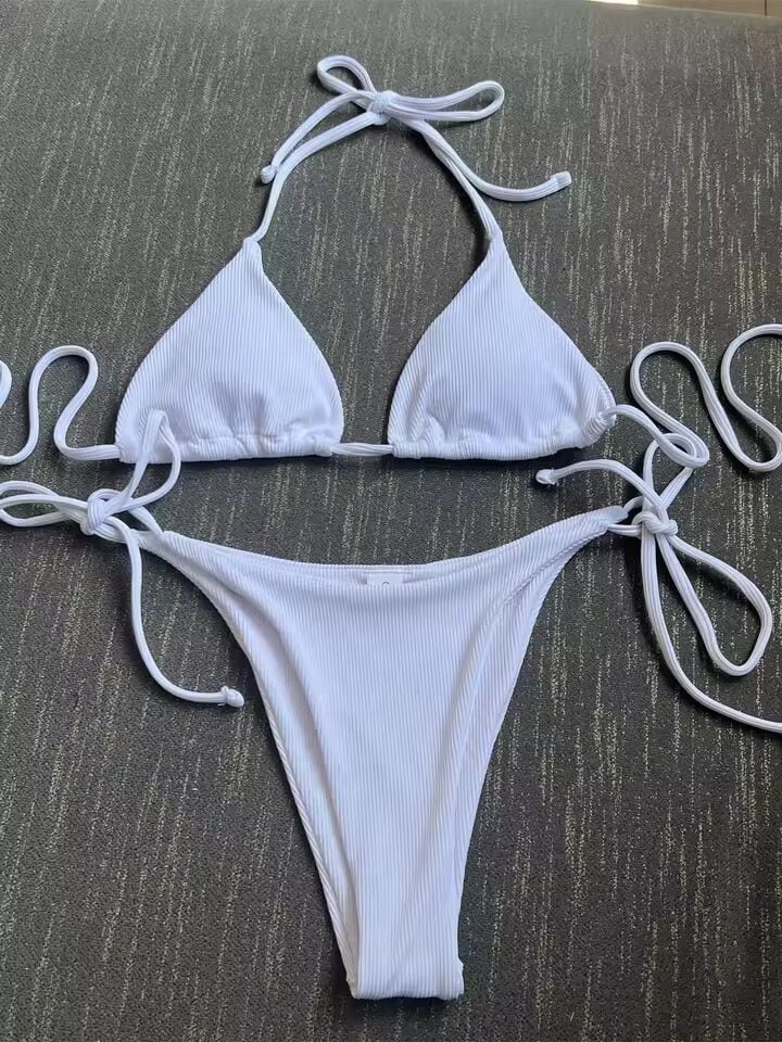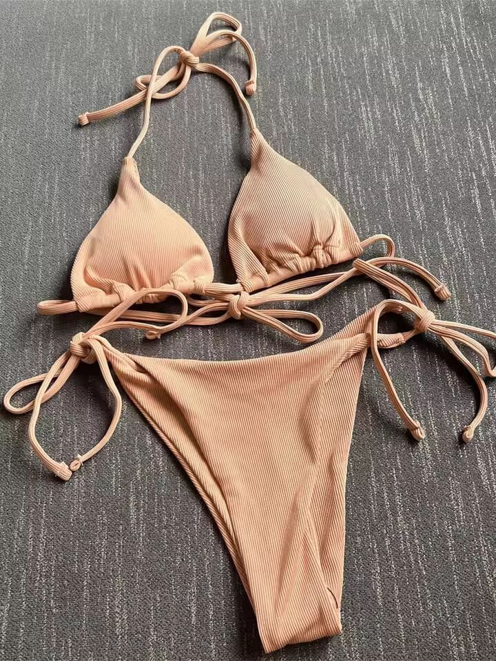 【送料無料◎】 セクシーなブラウンビキニ 2025 女性ソリッドレッドホルタープッシュアップブラジャーネクタイサイド三角水着夏水着レースアップマイクロ水着