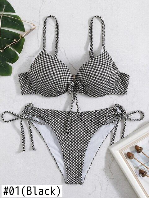 送料無料 2022セクシーな黒の格子縞プッシュアップビキニ女性水着ストリングサイドタイ水着水着水着ビキニビーチウェア ブラック AE15336655287776922