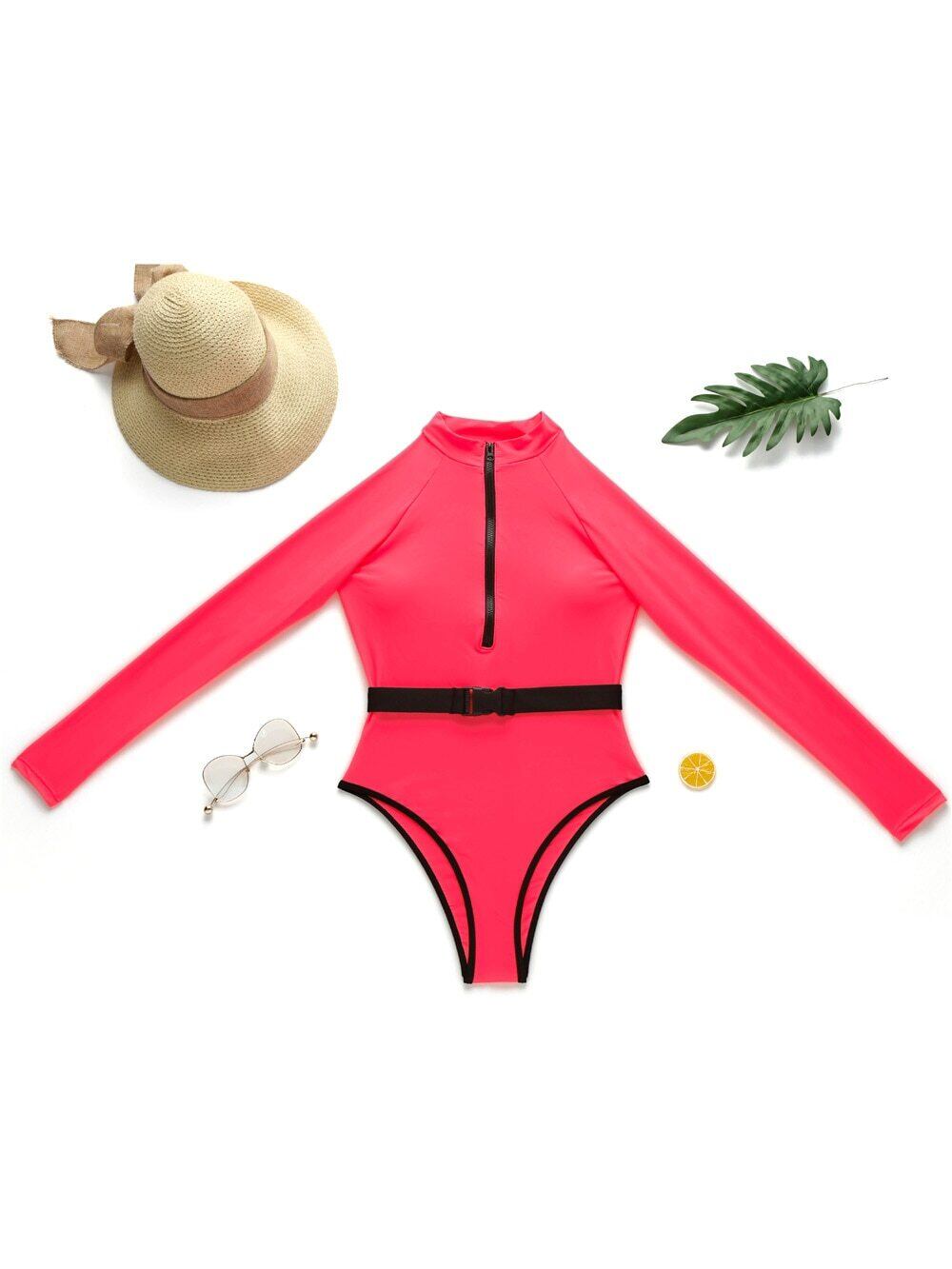 送料無料 2022ネオン長袖水着女性セクシージッパーベルトカットレッグワンピース水着スポーツウエストバススーツサーフラッシュガード ロング ハーネス AE15336677495238569