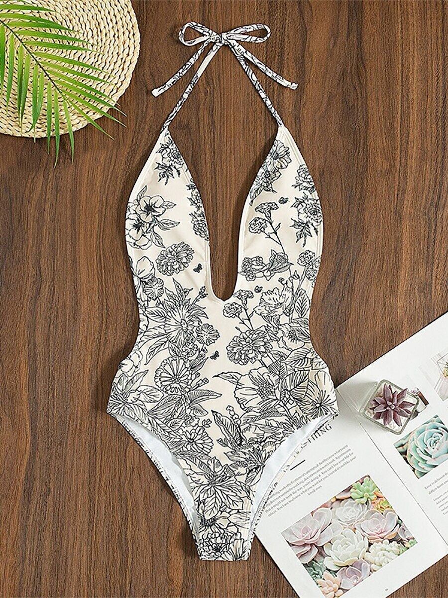 送料無料 ホルターネックバックレス水着セクシーな女性花柄水着2022ディープVネックプランジ水着ワンピースサマーモノキニ 夏物 AE15336612794606152
