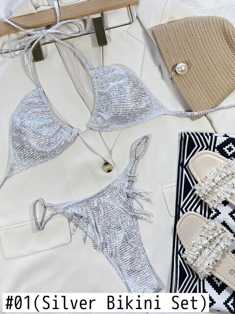 送料無料 マイクロトンブラジリアンビキニセクシーストリング水着女性シャイニーグリッターホルターネック水着2022シルバーフリンジバススーツ夏 サマー 夏物 銀 AE15336630744591162