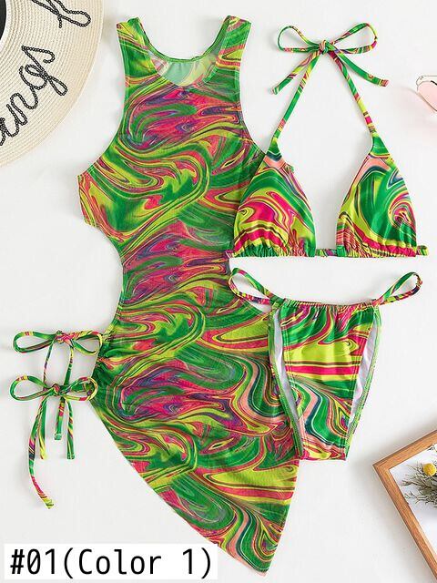 送料無料 3ピースストリングビキニセットセクシーストライプカットアウト水着カバーアップ女性スワールウェーブ水着2022バススーツツーピースサマー 夏物 AE1533668766402185