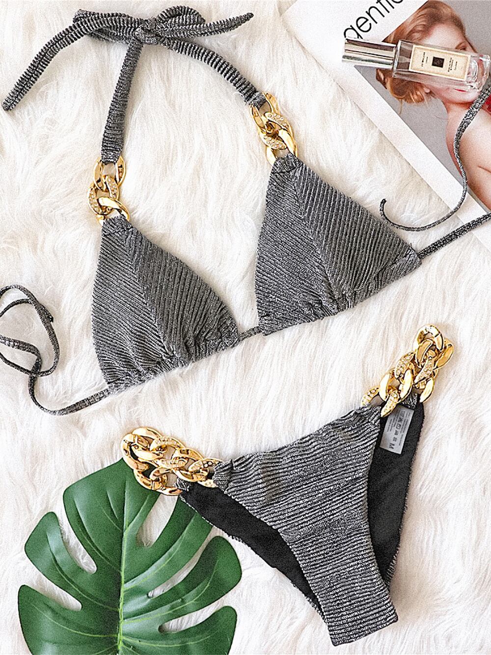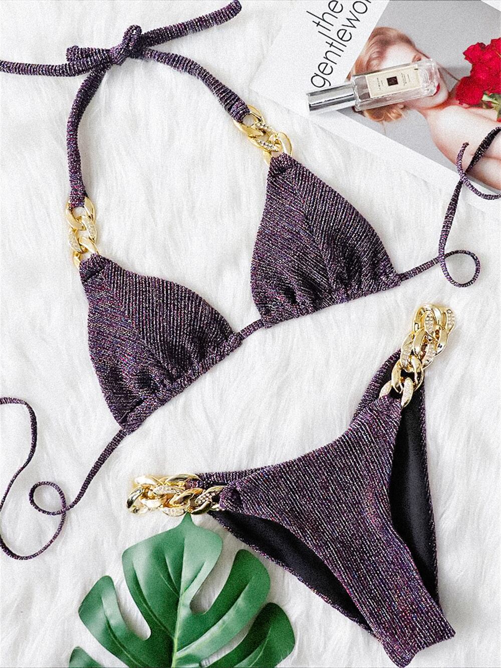 送料無料 2022セクシーなラインストーンチェーンストラップビキニセット女性水着ストリングホルター水着プッシュアップ水着水着ビーチウェア AE15336650487618047