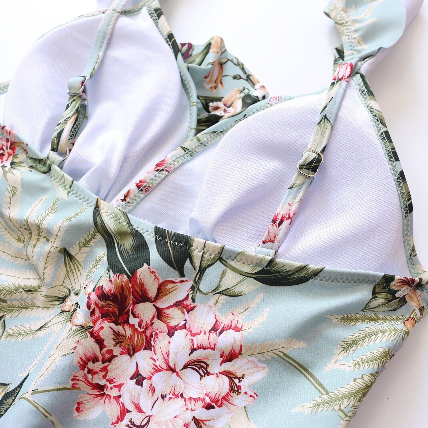 送料無料 セクシー2022レディレトロフローラルプリーツVネックフリル水着レディースワンピース水着スモックウエストバススーツモノキニトリキニ 花柄 AE15336660387127693