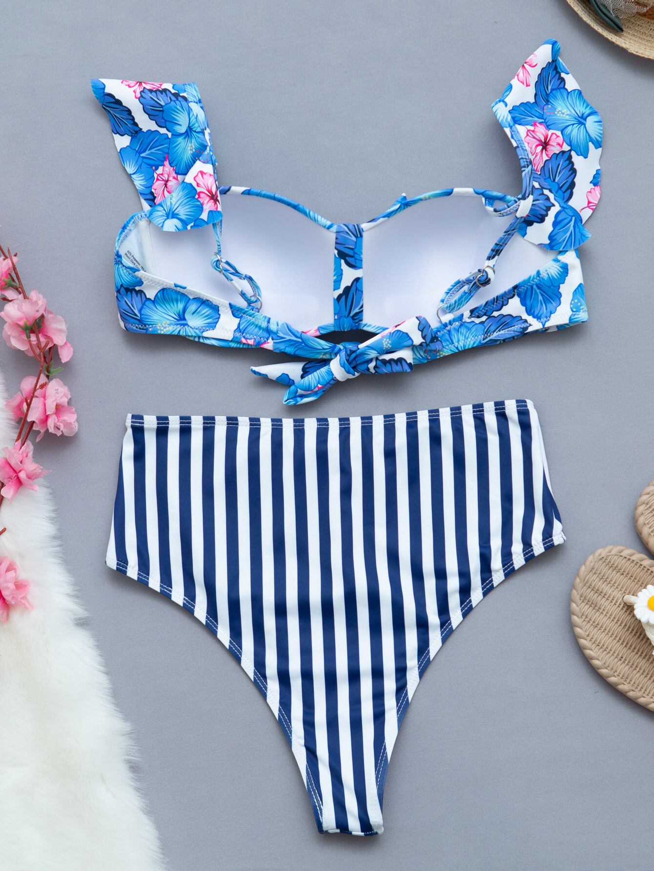 送料無料 セクシーなウエストビキニストライプ水着女性水着フリル水着女性ビーチウェア水着女性2ピースセット AE377653353671095995