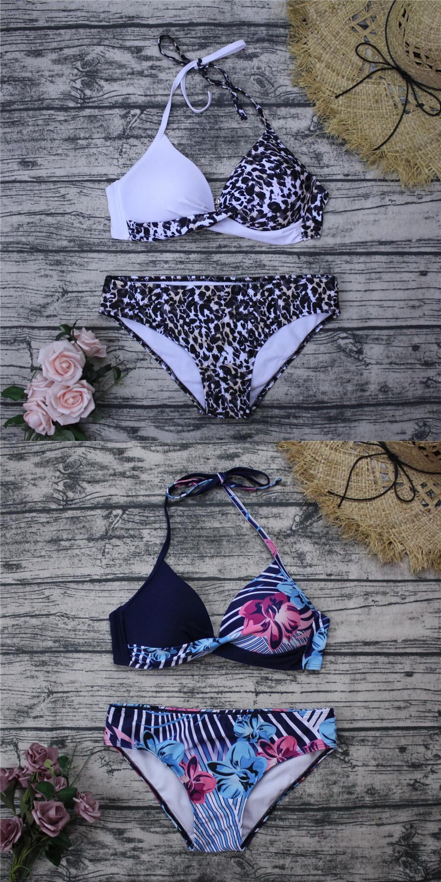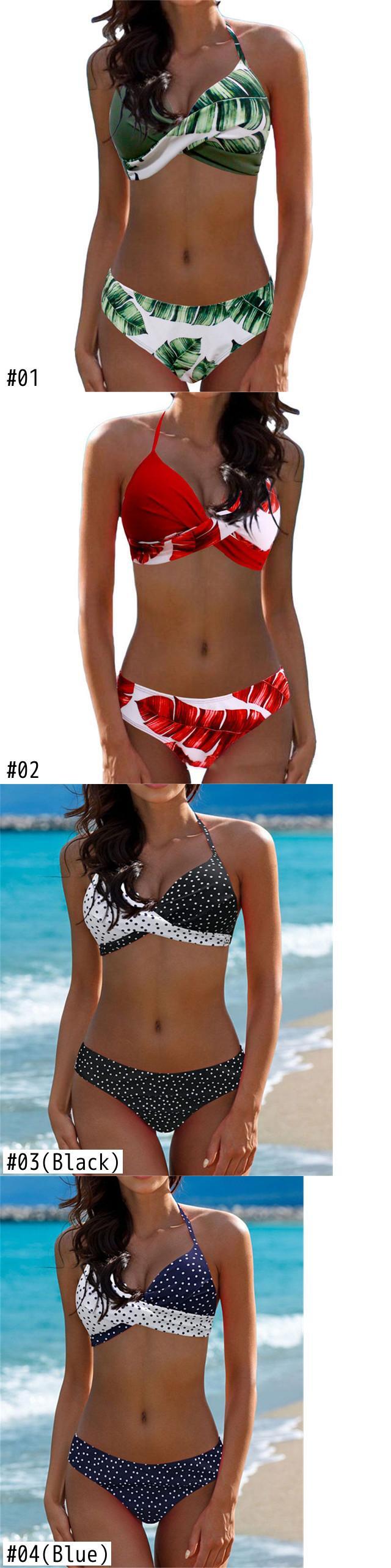 送料無料 セクシーなプッシュアップビキニセット水着女性水着水着女性ホルタービキニリーフプリントビーチウェア水着女性 AE377653383608761779