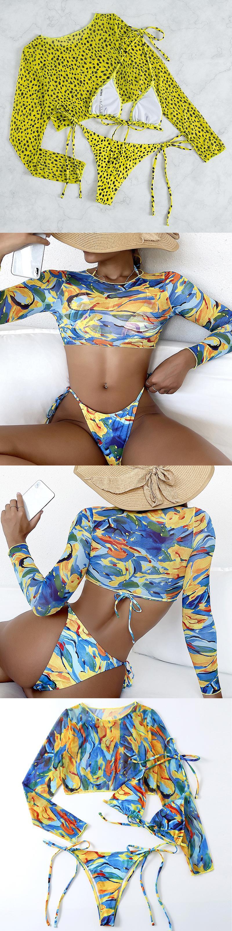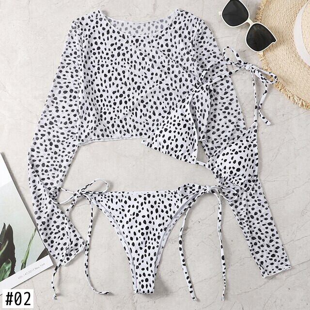送料無料 ヒョウ柄3枚ビキニセット長袖レディース水着セクシーバンデージビキニ2022水着レディース水着水着 ロング AE377653393240903983