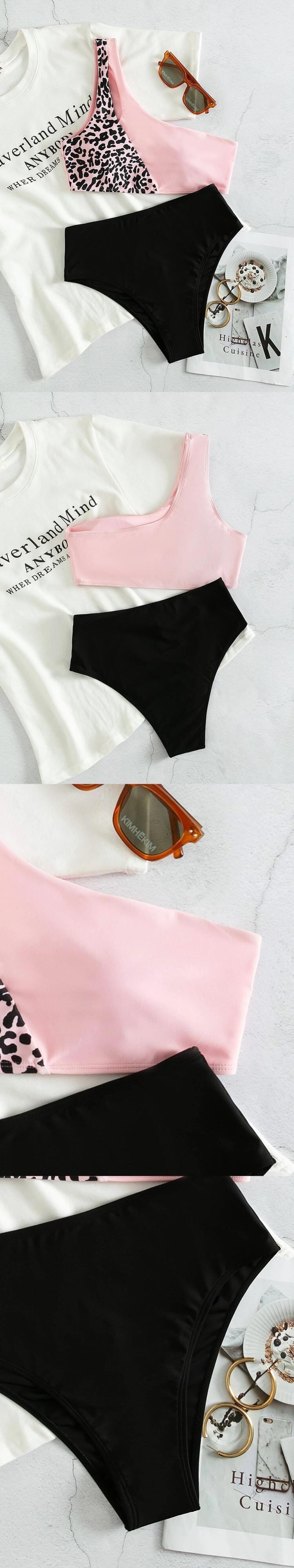 送料無料 セクシーなヒョウビキニワンショルダー水着女性水着ツーピースビキニセットウエスト水着ビーチウェア AE377658837569732545