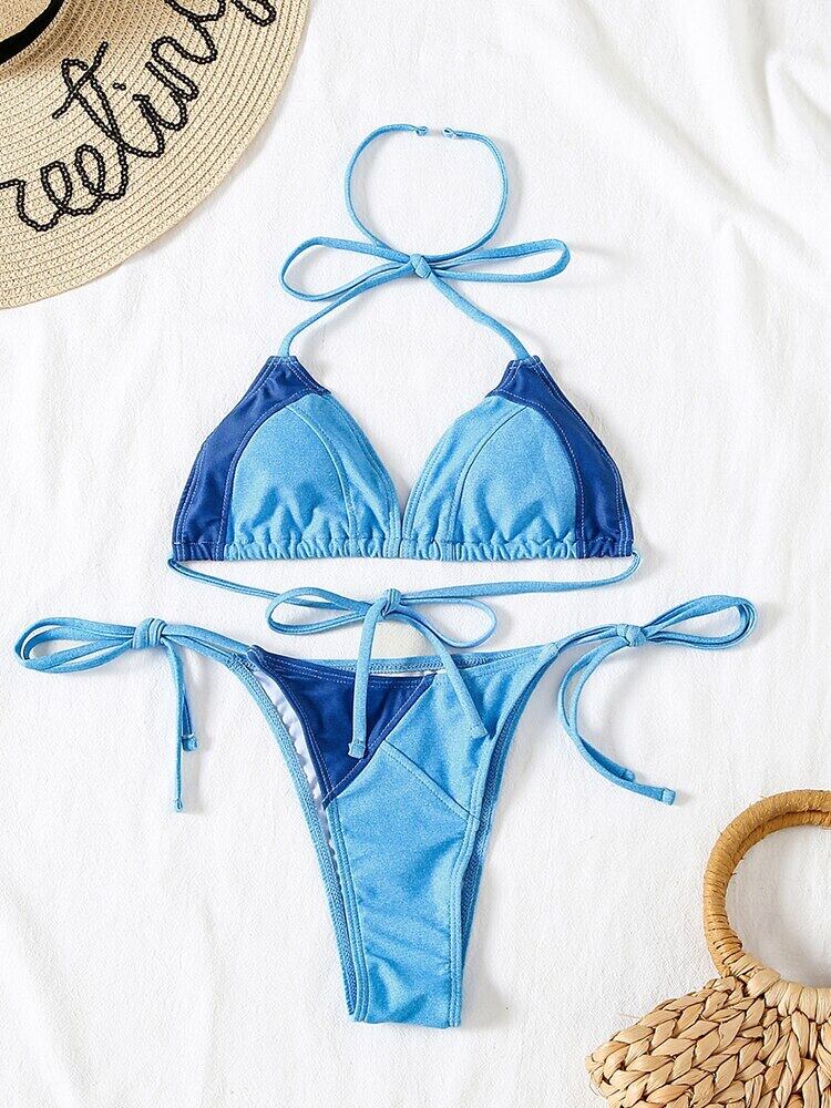 送料無料 2022レースアップビキニブルーパッチワーク水着ステッチ女性ストリングセクシースプリット水着サマービーチ水着 夏物 AE36656669997999699