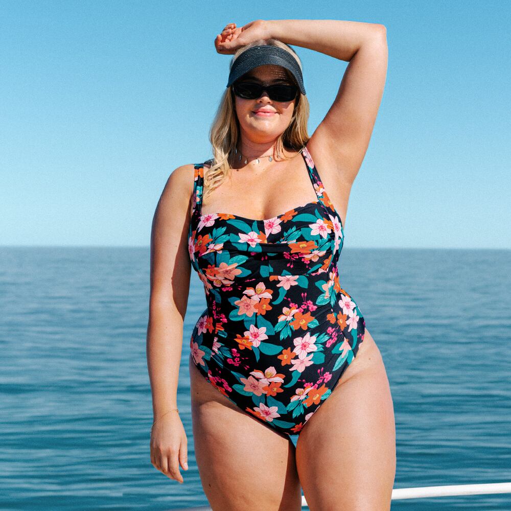 送料無料 SEASELFIEプラスサイズシャーリングブラックフローラルワンピース水着女性ラージサイズモノキニ水着2022ビーチ水着 大きめサイズ 花柄 AE37766668392226404