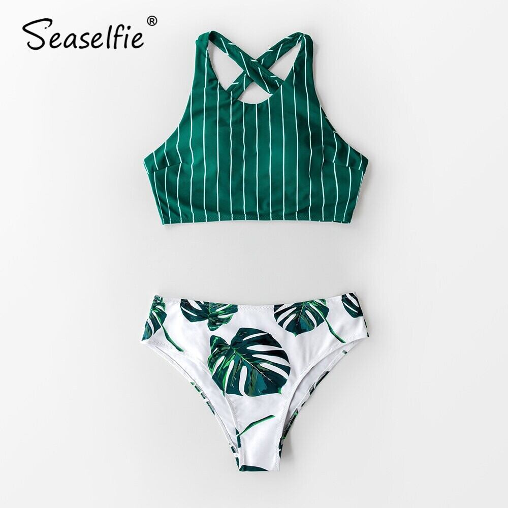 送料無料 SEASELFIEセクシーなティールストライプと葉プリントビキニセット女性タンク水着2ピース2022女の子ビーチ水着水着 AE37766618103576604
