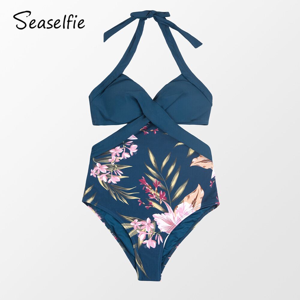 送料無料 SEASELFIEプッシュアップカットアウトホルターワンピース水着女性フローラルセクシーツイストモノキニ水着2022水着ビーチウェア 花柄 AE37766649995165057