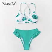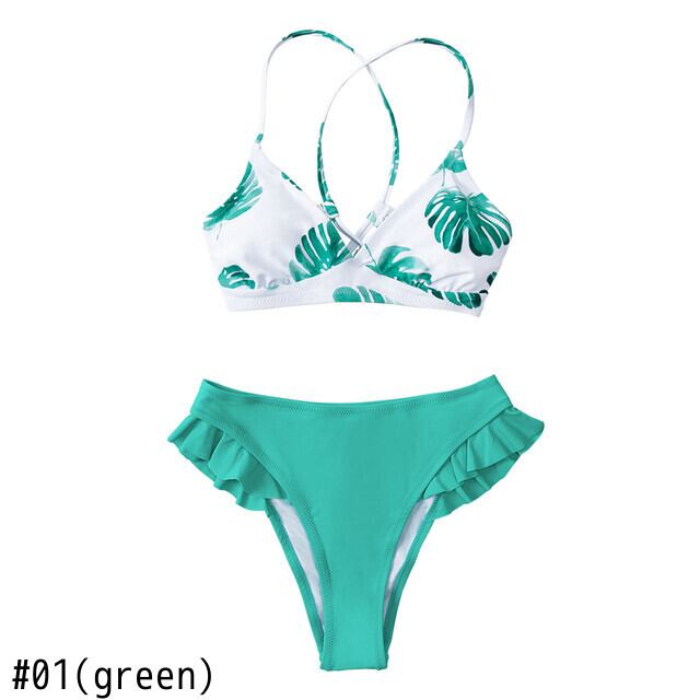 送料無料 SEASELFIE緑豊かなクリスクロスサイドフリルウエストビキニセット水着女性ツーピース水着2022水着ビーチウェア AE37766666043888750