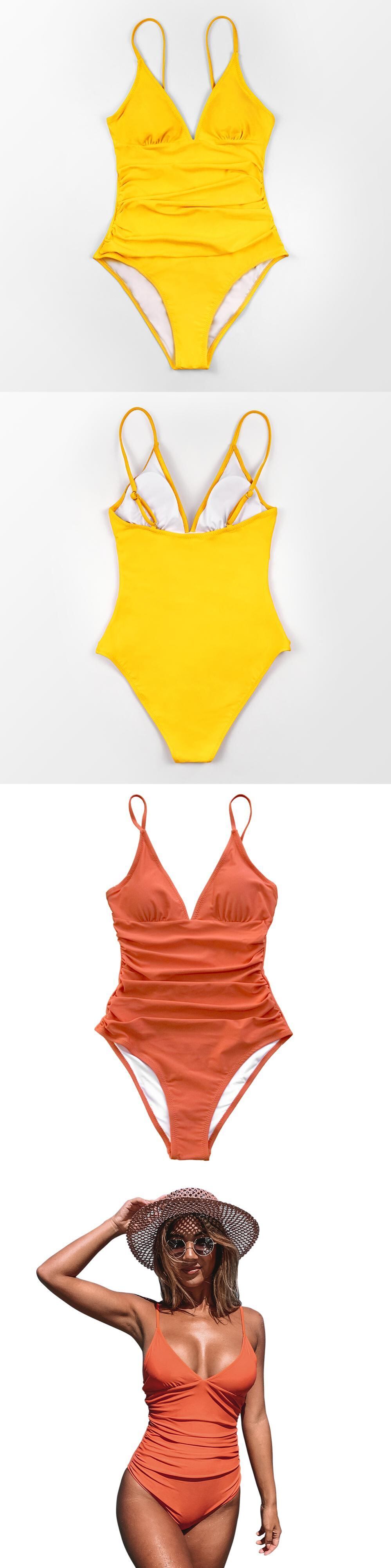 送料無料 SEASELFIEセクシーなソリッドオレンジシャーリングVネックワンピース水着女性モノキニ2022ビーチ水着水着 ソリッドカラー AE37766682165648112