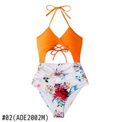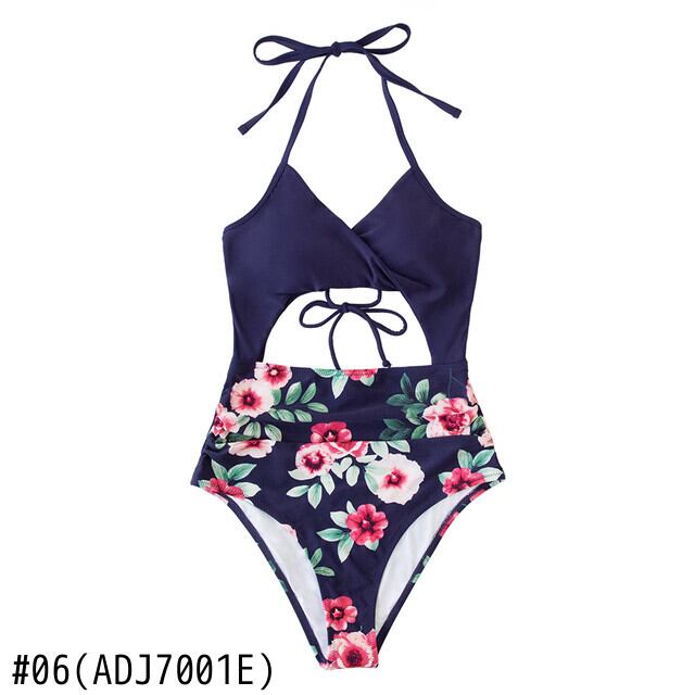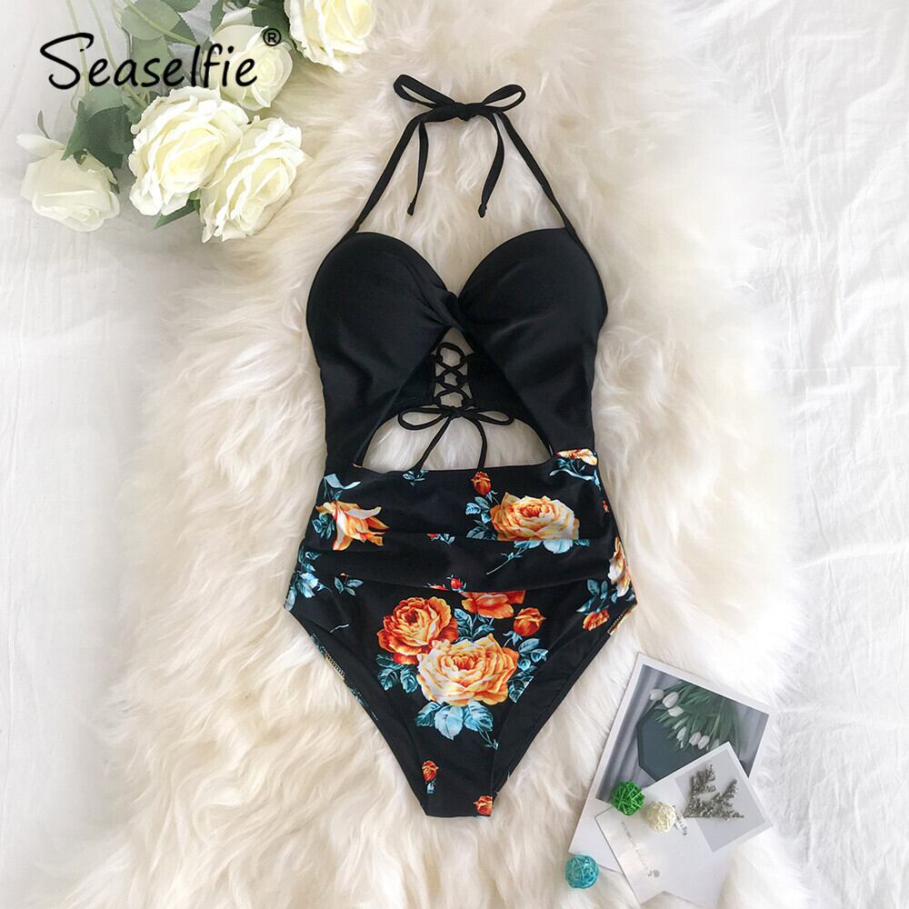送料無料 SEASELFIEブラックフローラルプリントホルターワンピース水着女性2022セクシーカットアウトレースアップビーチウェア水着サマー水着 夏物 花柄 AE37766684326271575