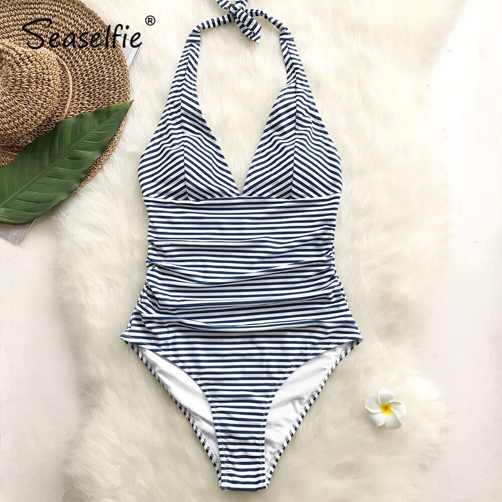 送料無料 SEASELFIEブルーストライプホルターワンピース水着セクシーなオープンバック水着女性モノキニ水着ボディスーツ水着ビーチウェア AE3776667714024425
