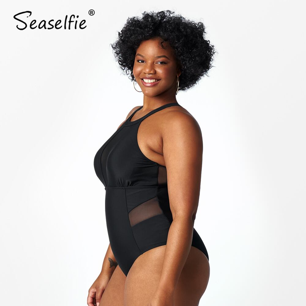 送料無料 SEASELFIEプラスサイズブラックネックメッシュワンピース水着女性ラージサイズセクシーモノキニ水着2022ビーチ水着 大きめサイズ AE37766630769102464