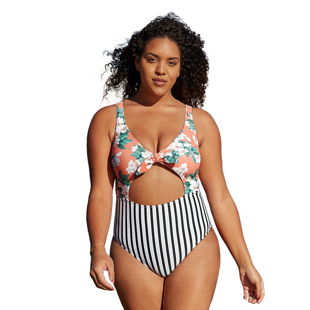 送料無料 SEASELFIEプラスサイズフローラルストライプカットアウトワンピース水着女性セクシーラージサイズモノキニ水着2022ビーチ水着 大きめサイズ 花柄 AE3776661979254517