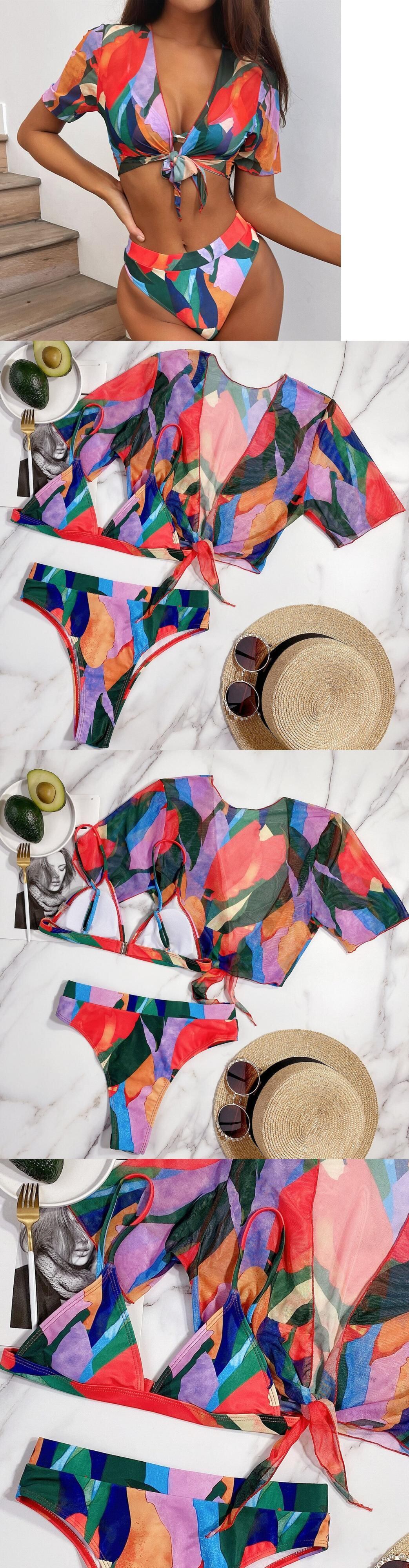 送料無料 RUUHEEビキニレディース2021ウエスト水着レディースカラーブロックプリントフリル3点セット水着ビキニセットビーチウェア AE377776620067407561