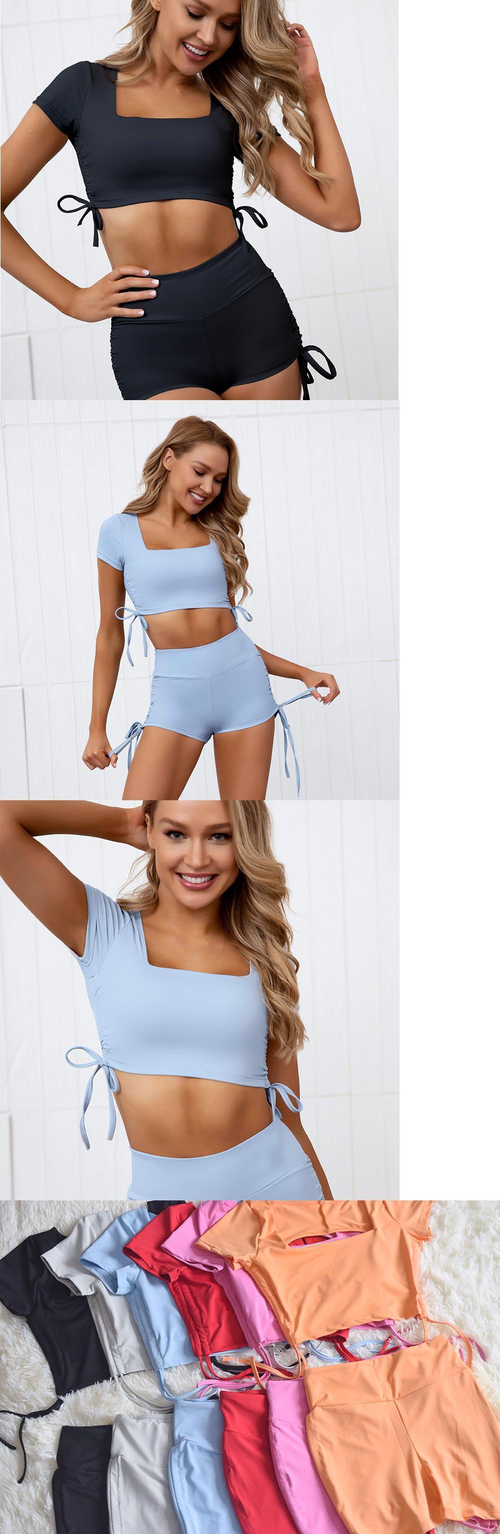 送料無料 RUUHEEスクエアカラーヨガセット女性トラックスーツショートヨガパンツソリッドウエストおなかコントロールワークアウト服女性ジムセット ソリッドカラー スクウェア AE377776637568553735