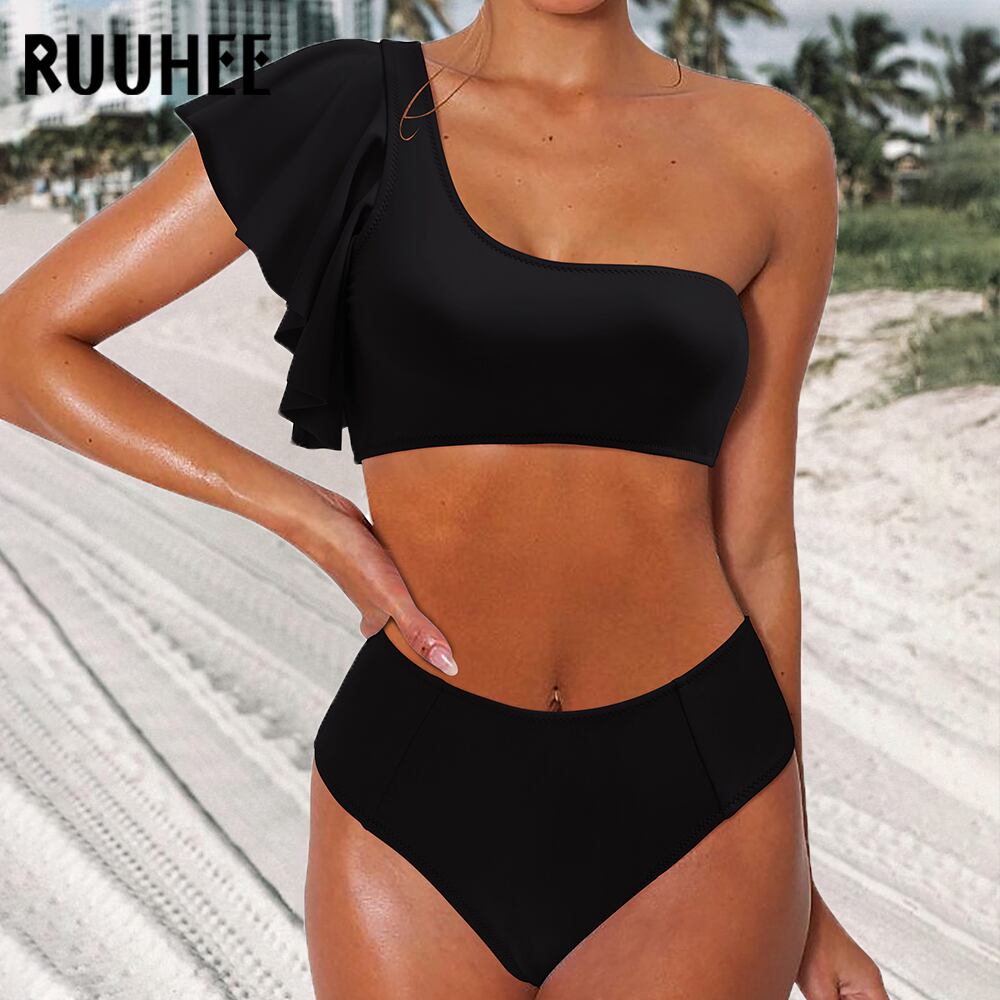 送料無料 RUUHEEワンショルダービキニセットウエスト水着ソリッドフリルタンクトップツーピース水着女性ビキニ2022水着 ソリッドカラー AE377776652324810043