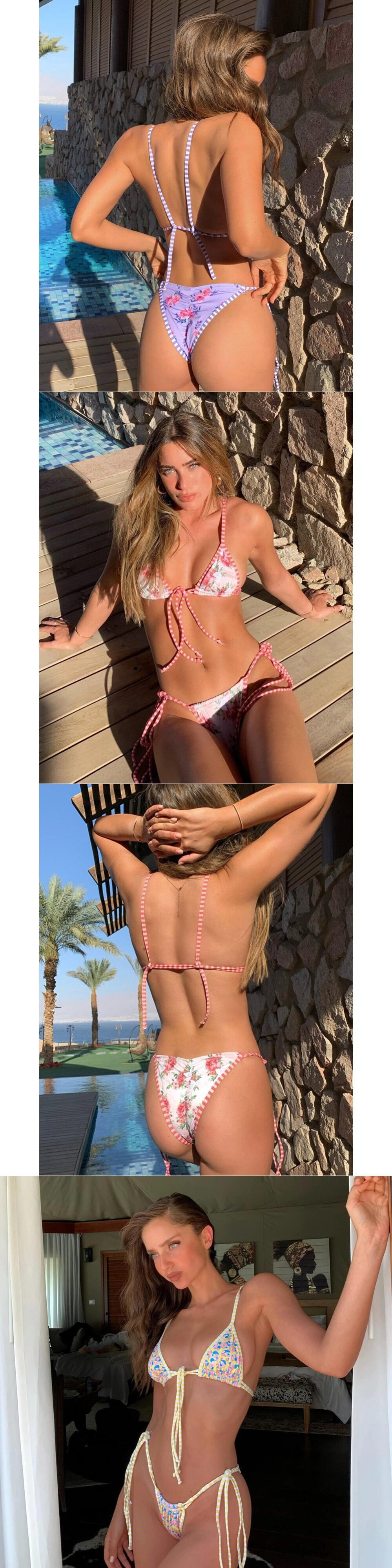 送料無料 2022セクシーなロービキニセット水着女性プリントフローラルブラジルホルターバックレス水着ストラップ付きビーチウェアドットビキニ女性 花柄 AE322113320870315008