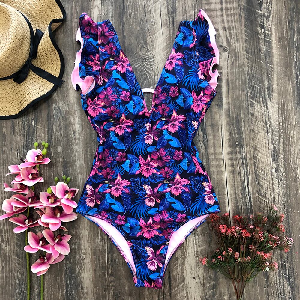 送料無料 2021フリルワンピース水着オフショルダー水着女性プリントフローラルディープV水着ボディスーツビーチウェアモノキニ 花柄 AE322113371455351992
