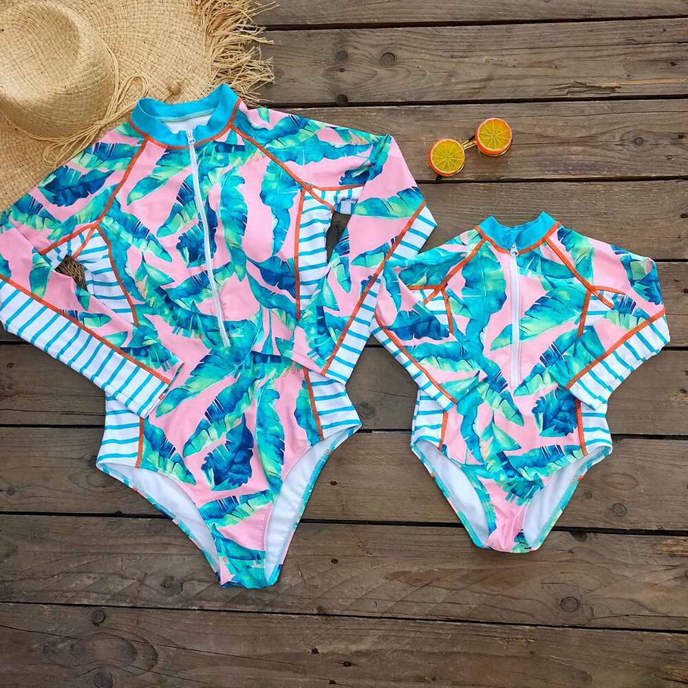 送料無料 ワンピース水着2021親子長袖水着女性水着赤ちゃん背中の開いたプリント水着ビーチウェア ロング AE322113383775436072