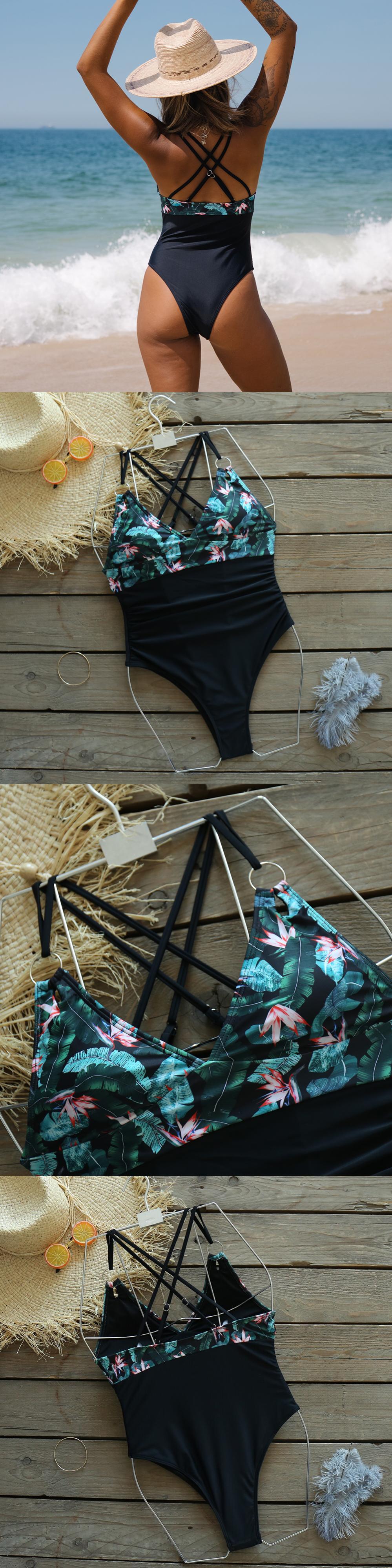 送料無料 プリントフローラルVネックOリングワンピース水着女性セクシークリスクロスバックモノキニ2022ビーチ水着水着 花柄 AE322113370341265305