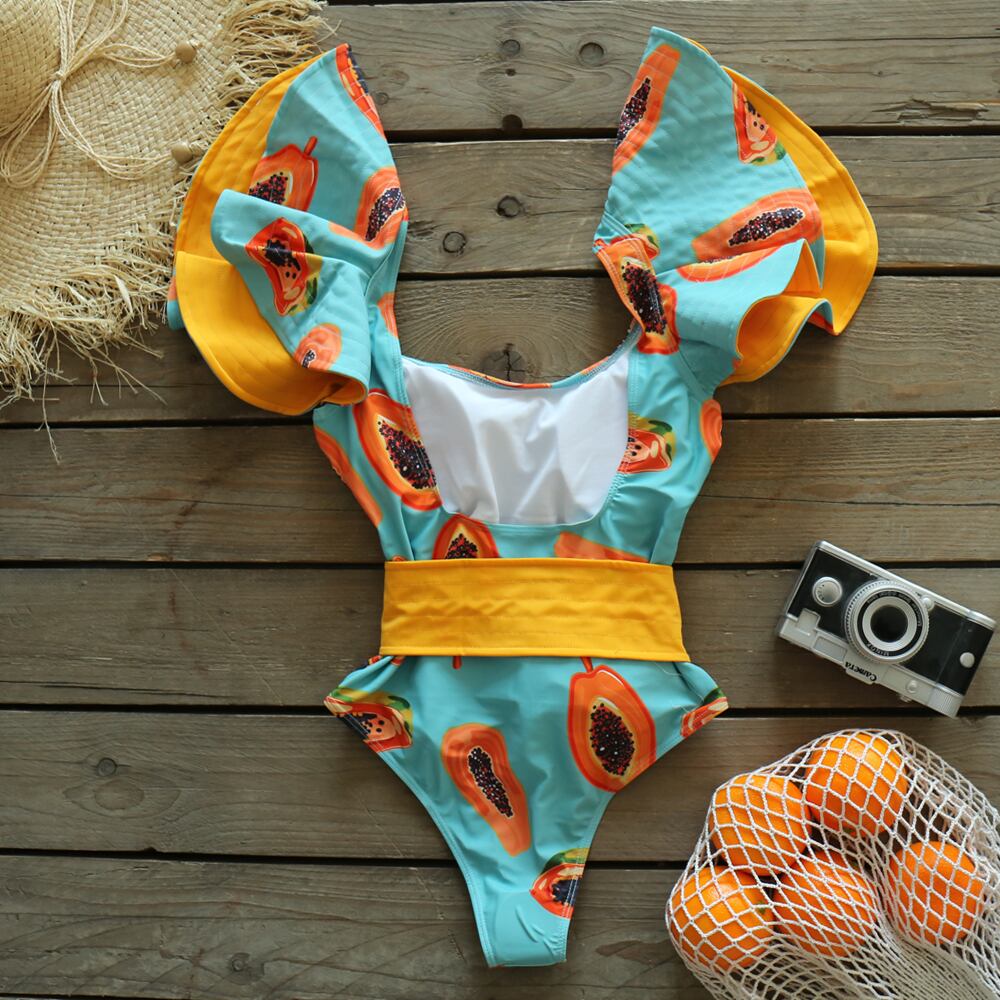 送料無料 2022セクシーフリルフローラルプリントワンピース水着女性水着ベルト入浴スーツ背中の開いたビーチウェアモンキニ ハーネス 花柄 AE3553333818310981