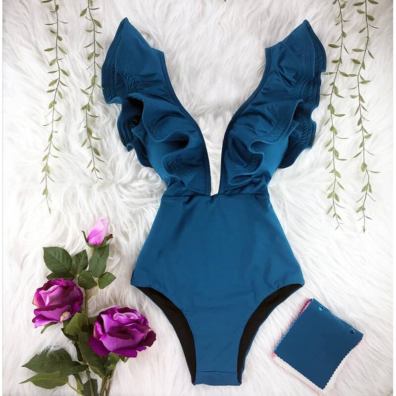 送料無料 2020フリルワンピース水着オフショルダー水着女性ソリッドディープV水着ビーチウェア水着ビキニ ソリッドカラー AE3553389219391731