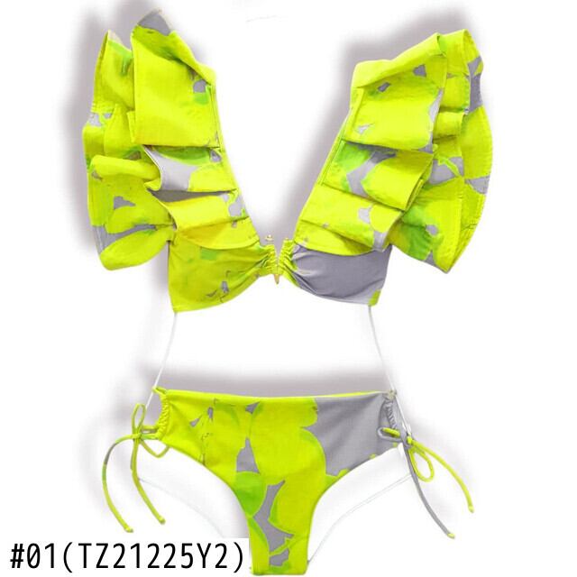 送料無料 セクシー水着フリルストラップビキニフェミニーノ2022水着イエロープリント水着ブラジリアンビキニセットビーチウェア AE3553335588956754