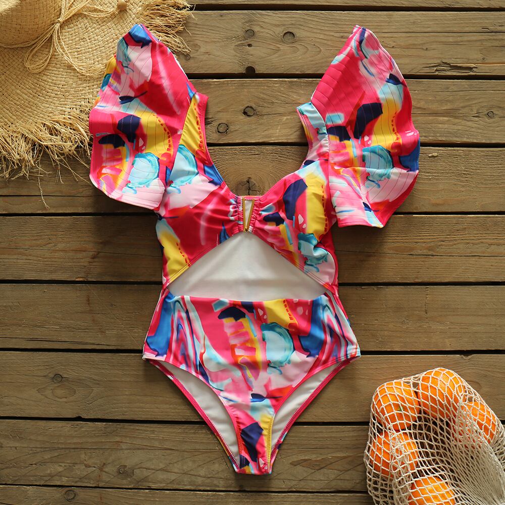 送料無料 2022セクシーなフリルタイダイプリントワンピース水着女性水着ショルダーフリル水着背中の開いたビーチウェアモンキニ AE3553318884179810