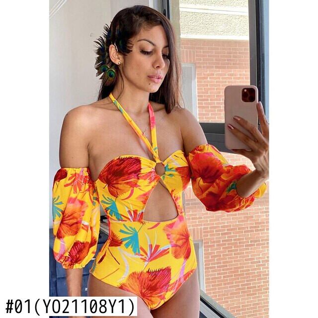送料無料 2022中空アウト水着パフスリーブワンピース水着女性花柄プリントトロピカルサマービーチ水着 夏物 AE3553379518725218
