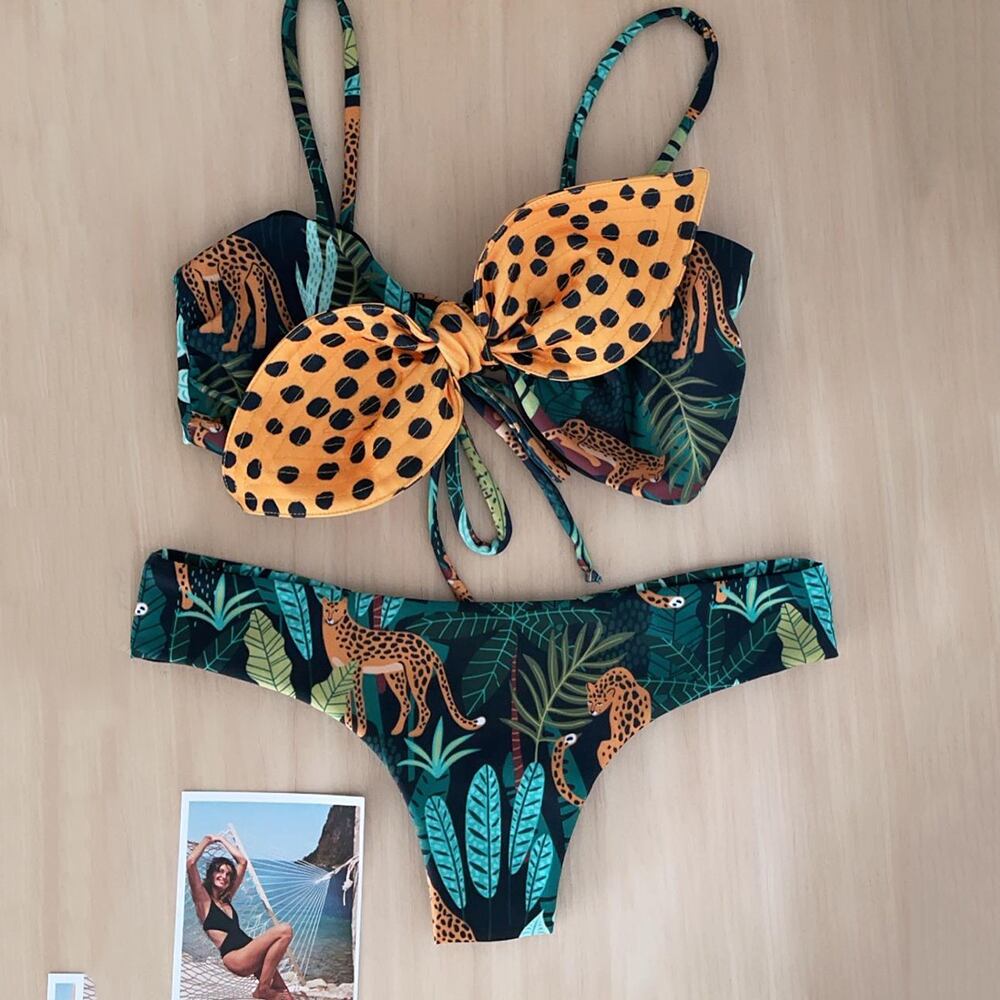 送料無料 セクシーなヒョウと葉のプリントビキニ女性水着ドットボウビキニセットブラジルの水着ビーチウェア女性 リボン AE3553346671669686