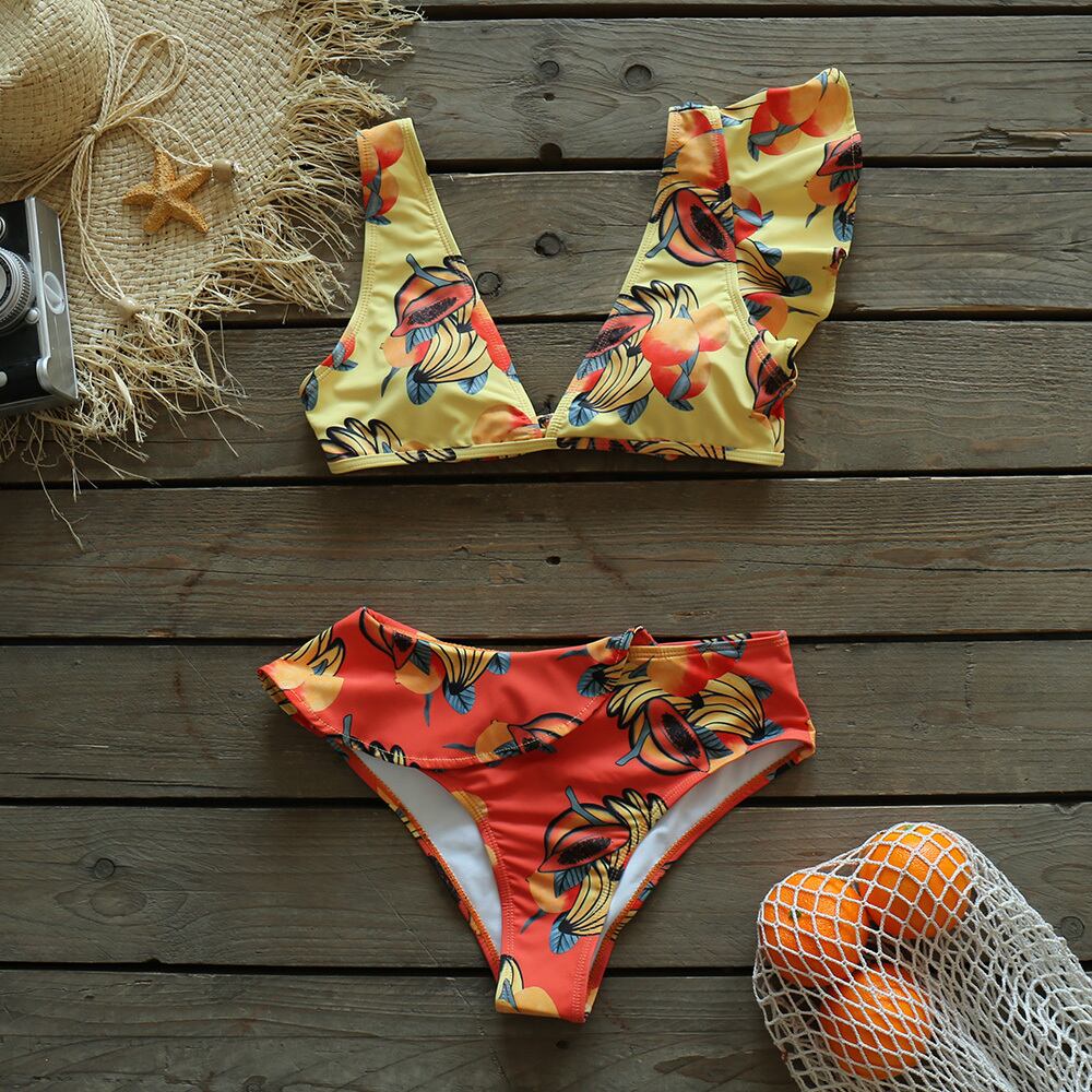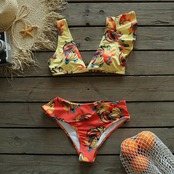 送料無料 2022プリントビキニレディース水着ショルダーフリル水着ウエストビキニ水着フローラルプリントビーチウェアサマー 夏物 花柄 AE3553374062783611