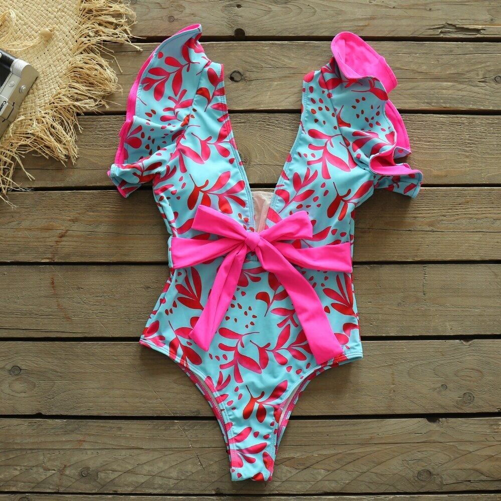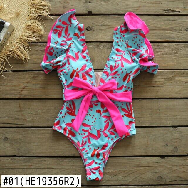 送料無料 プリントワンピース水着2021セクシーショルダーフリル水着女性水着バンデージ水着ビーチウェアモノキニスイム AE3553394145550129