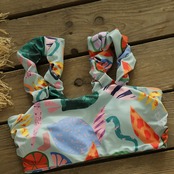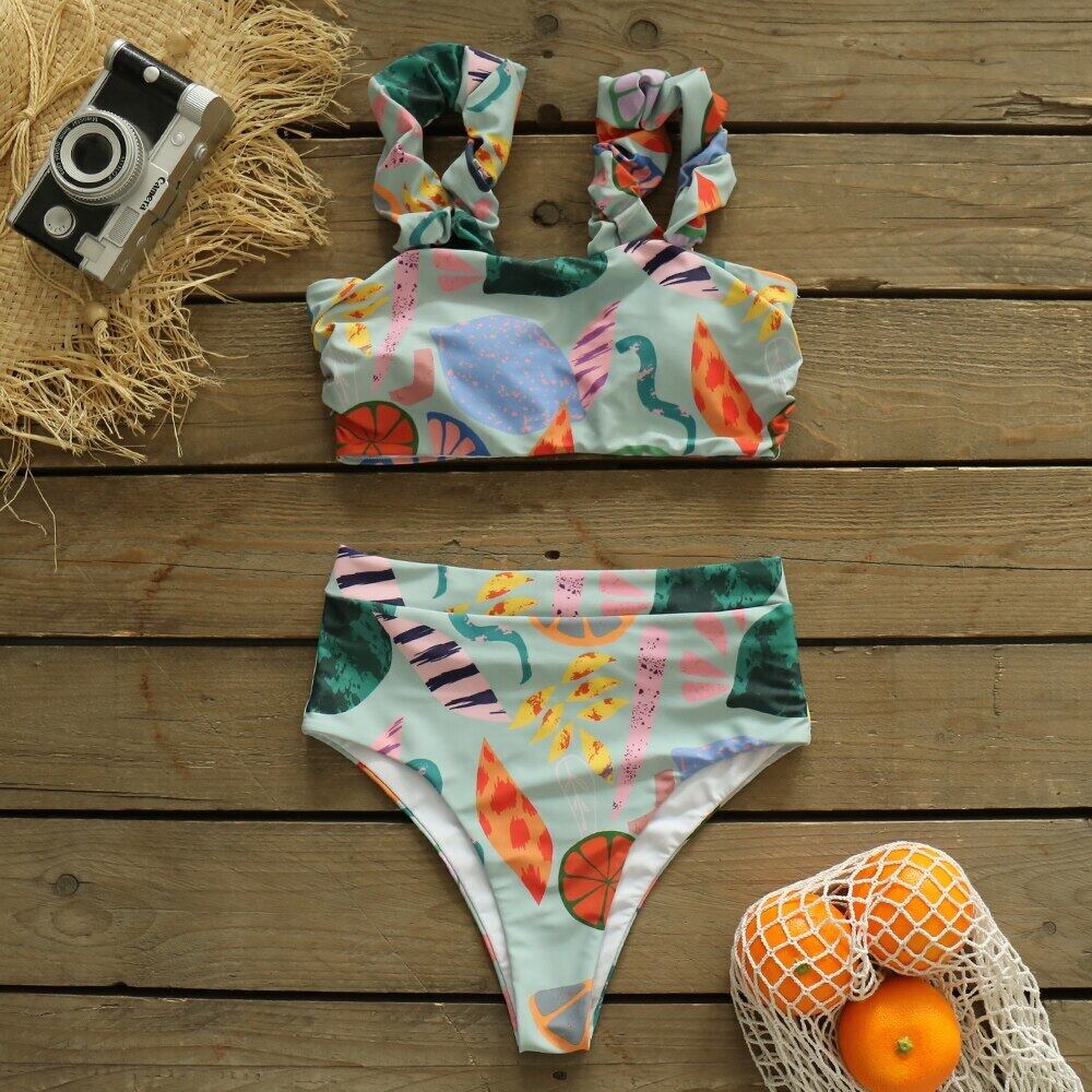 送料無料 セクシーな女性のショルダーフリルビキニセット2021バンドー水着プリント水着ウエスト水着ビーチウェアビキニ女性 AE3553342128449457