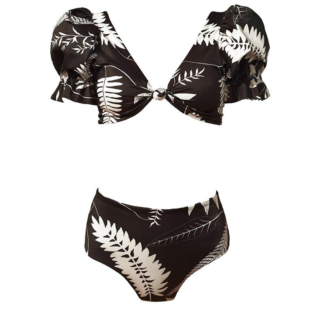 送料無料 セクシーなビキニの女性の水着半袖水着ウエスト水着ビーチウェアの葉プリントビキニ ショート ハーフスリーブ AE3553376255945849