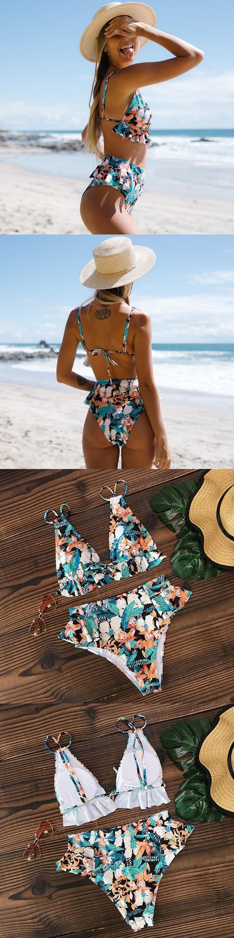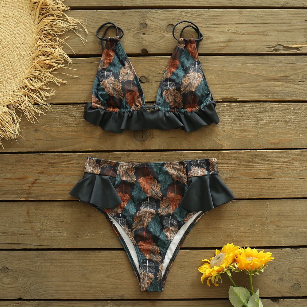 送料無料 2021セクシーリーフプリントビキニセットセクシー水着かわいい水着女性水着フリルビキニウエストMaillotDeBain 大人ガーリー スウィート キュート カジュアル AE3553348757995939