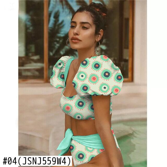 送料無料 2021プリントウエストビキニセットホワイトパフスリーブ水着女性プッシュアップ包帯水着水着ビーチウェア AE3553341183614841