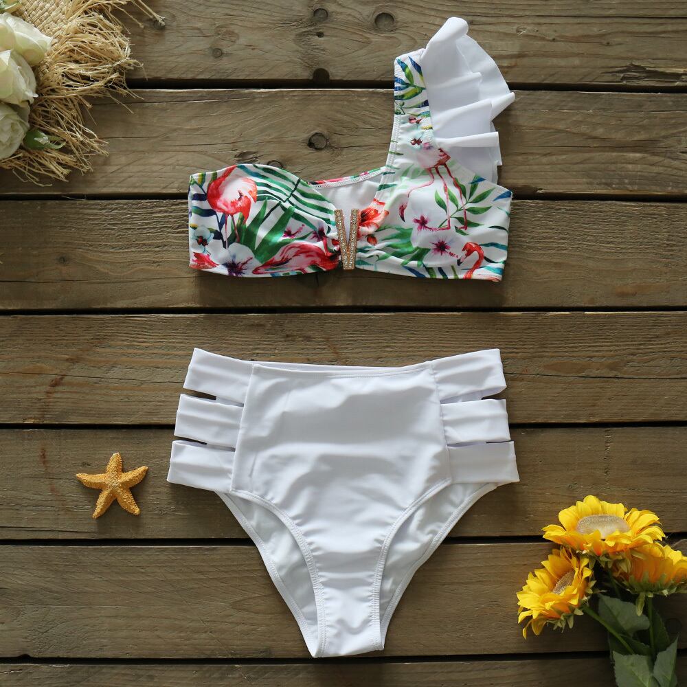 送料無料 セクシーな白いビキニの女性のウエスト水着ショルダーフリルプッシュアップビキニセット入浴スーツビーチウェアサマービキニ ホワイト 夏物 AE3553380309365558