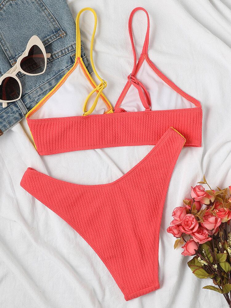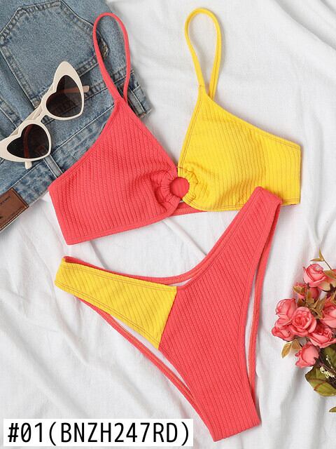 送料無料 BIQIUYYI赤と黄色のパッチワークツーピースセットビキニ女性夏セクシープッシュアップ水着ビーチウェアミッドウエスト水着 レッド サマー 夏物 AE333221117967521153