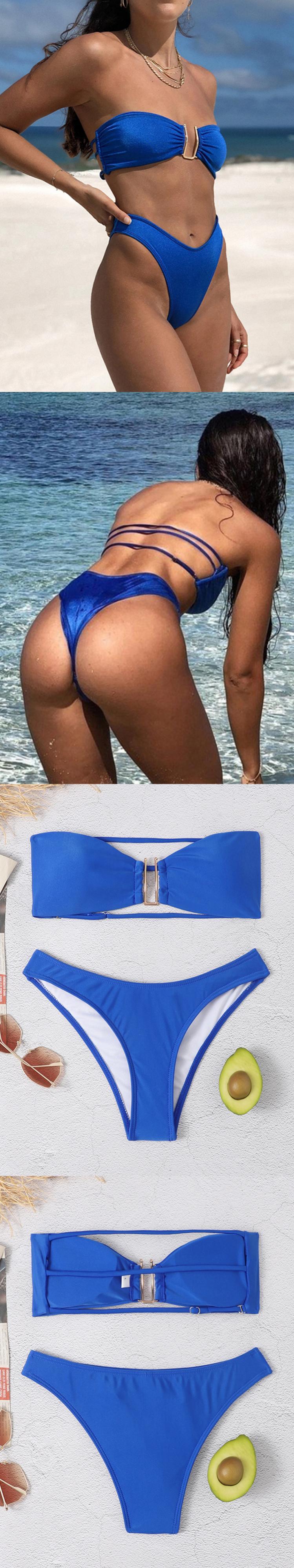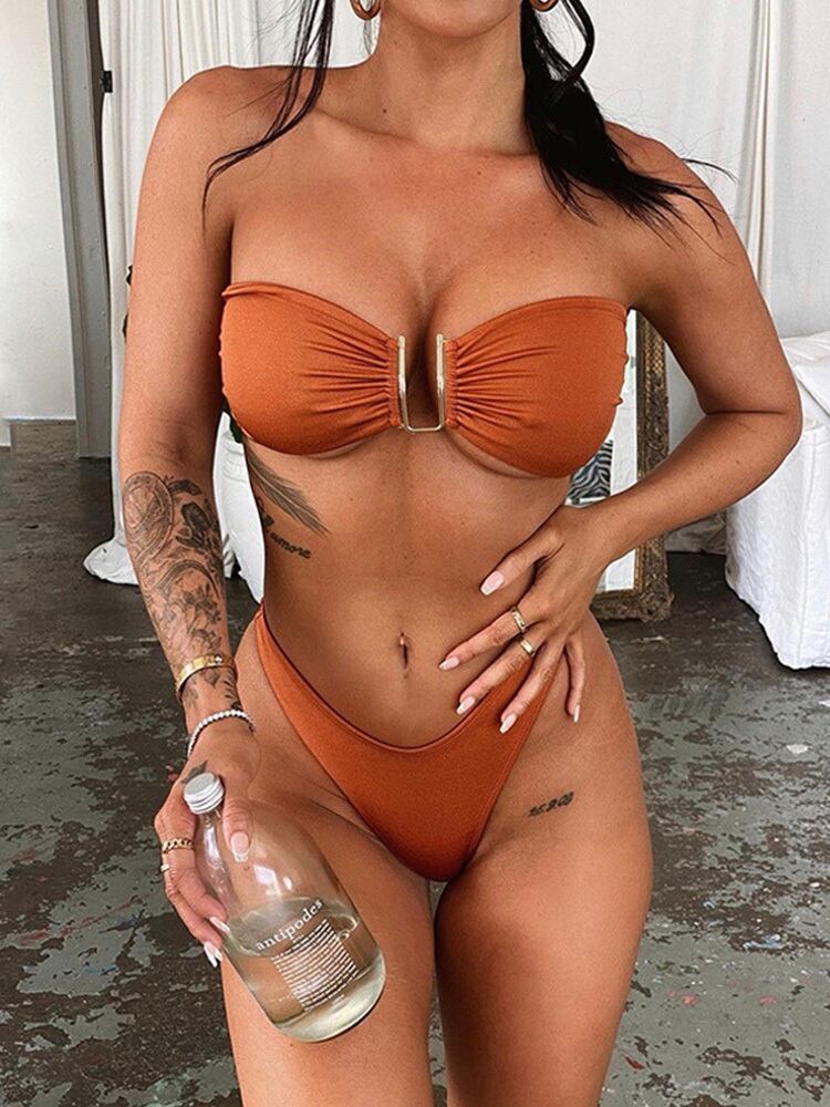 送料無料 BIQIUYYIセクシーバンドービキニセットサマーソリッドミッドウエスト水着女性バックホローアウト水着メタルUタイプビーチウェア 夏物 ソリッドカラー AE333221167133622964