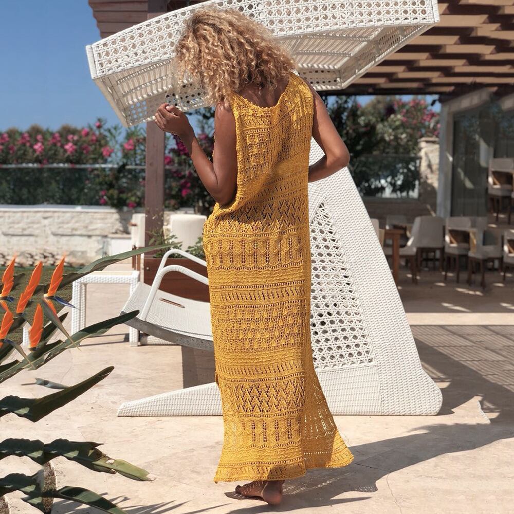 送料無料 2021ニットビーチカバーアップ女性ビキニカバーアップロングベストスカートホローアウトビーチドレス女性水着カバーアップアウターレディ AE36655544933608266