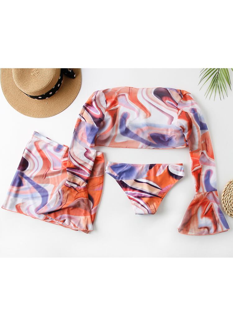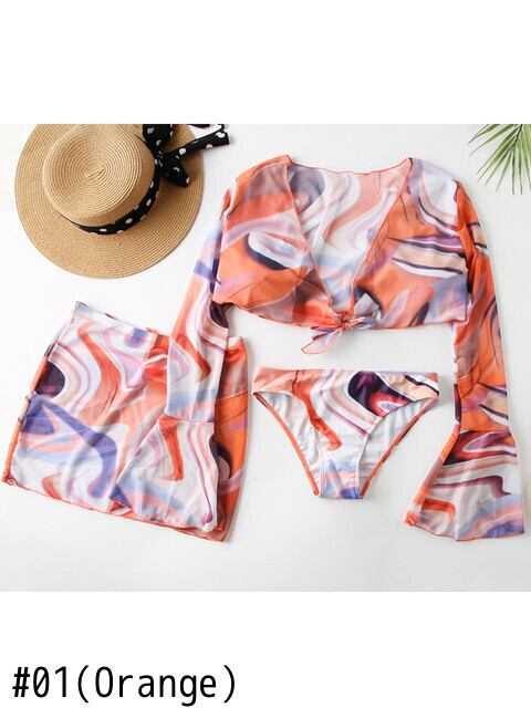 送料無料 2022年セクシープリントスリーピースビキニセットビーチスカート水着長袖水着女性水着ビーチウェア水泳 ロング AE36655557557626343