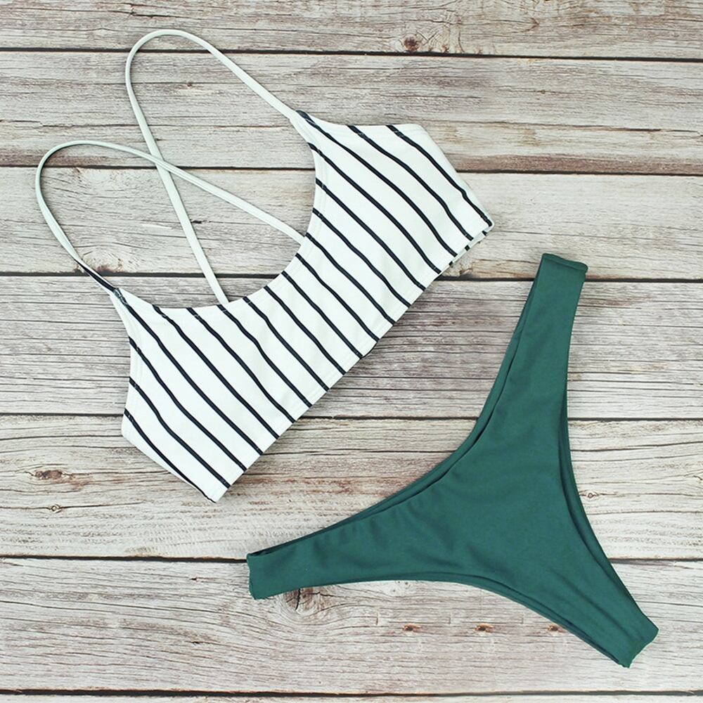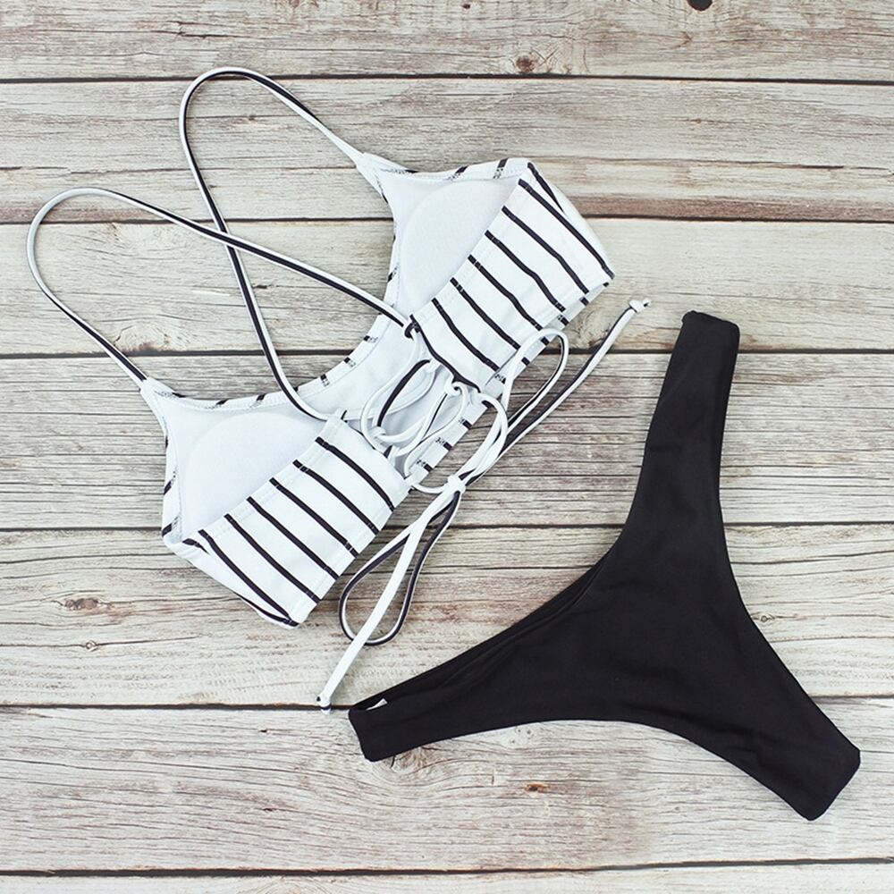 送料無料 2021セクシーなストライププリントビキニ包帯レースアップ水着女性水着2ピースビキニセット水着ビーチウェア AE36655575694715574