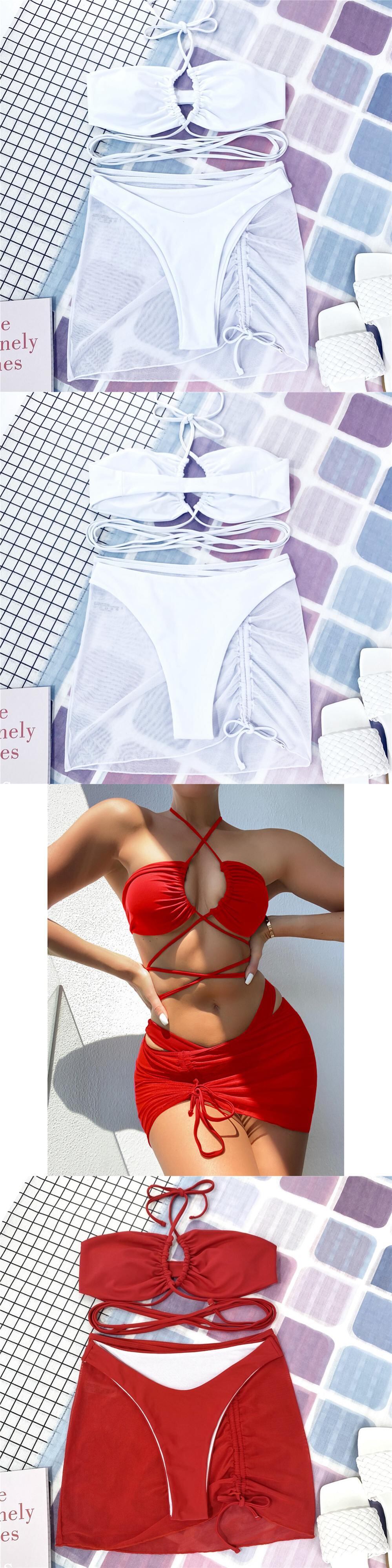 送料無料 3PCSソリッドホルタービキニ水着女性水着2021メッシュスカート水着ビーチウェア付きスリーピースビキニセット ソリッドカラー AE36655540993314725